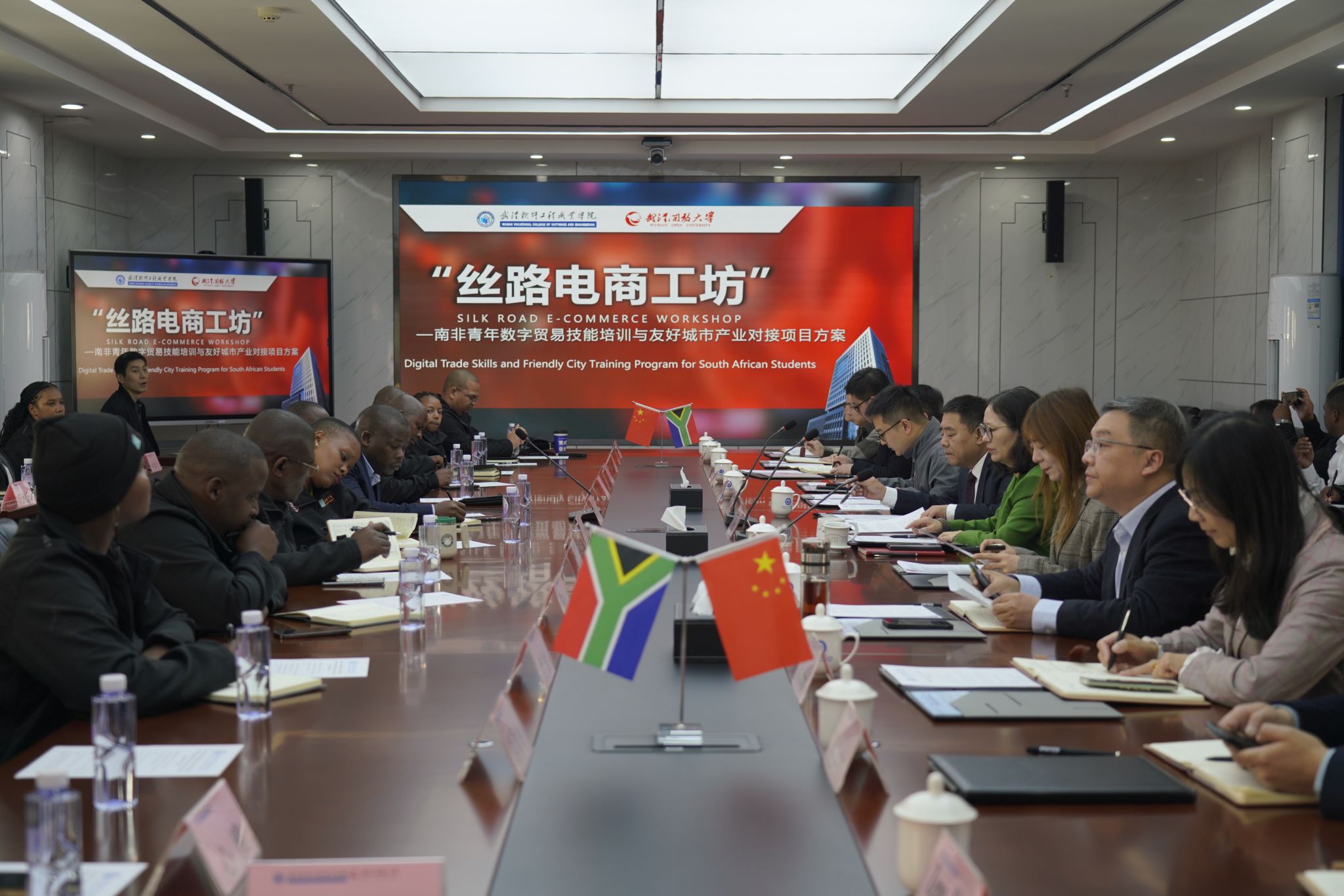 (通讯员 卢海燕)暖阳铺洒校园,生机充满武软。29名南非新生纷纷为新的学习环境点赞,12月2日,武汉软件工程职业学院2024年“丝路电商工坊(南非)”项目第二期——“数字贸易技能培训与友好城市产业对接(南非)”项目开班。校党委书记马蜂,副校长孙美华,党政办公室、教务处、商学院、文化旅游学院、艺术与传媒学院、体育学院、通识学院、国际学院负责人及武汉长贸数字产业有限公司总经理助理徐晖见证新一批南非学员正式开启在武汉软件工程职业学院的留学之旅。