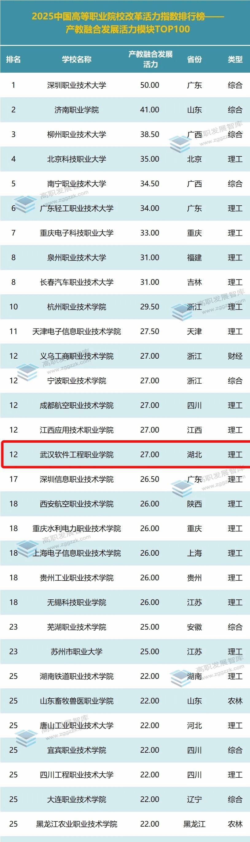 本期展示2025"产教融合发展活力"百强榜。“产教融合发展活力”模块重点考察高等职业院校在深化产教融合、校企合作,发挥市域产教联合体、行业产教融合共同体等产教融合载体作用方面的成绩,反映高等职业院校服务区域发展,支撑产业发展的优势度。武汉软件工程职业学院能跻身全国顶尖十二强,标志着其产教融合工作已走在全国最前列。
