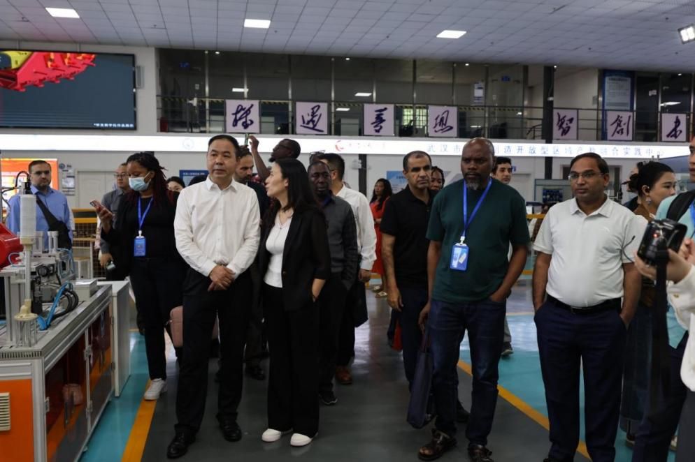 在产业学院考察现场,罗保山副校长向研修班成员系统介绍了学校“以数智化驱动职业教育革新,以产教融合链接全球视野”的发展理念。他重点讲解了学校依托武汉·中国光谷产业优势,在产业学院建设中融入数字化教学模块、搭建“线上+线下”跨国教学资源平台的实践——目前学校已与10余个外国院校共享数字课程资源,开发多语种职业技能培训课件20余套,助力全球职业教育协同发展。研修班成员认真聆听讲解,不时驻足察看5G实训设备、工业互联网模拟平台等数字化教学载体,详细询问设备运维、课程设置与企业需求的匹配逻辑,对学校将产业前沿技术转化为教学资源的做法频频点头认可。