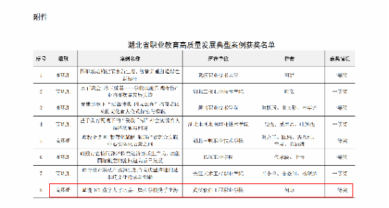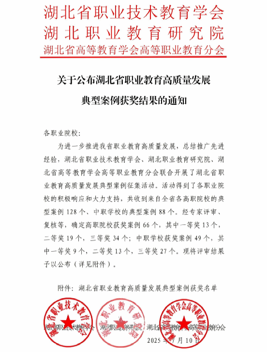 近日,湖北省职业技术教育学会、湖北职业教育研究院、湖北省高等教育学会高等职业教育分会联合公布了湖北省职业教育高质量发展典型案例获多个奖项。