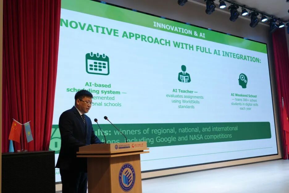 刘佳霓作“AI时代职业教育创新发展”主题报告,分享学校以“数字无界,智行天下”为理念,借助数智技术赋能教育教学与国际合作的实践。学校打造“一网一库一中枢”数智基座,通过“AI+”多场景创新培养数智人才,积极“职教出海”与多国开展合作。面向中哈合作,学校提出专业共建、课程共融、师资共通、平台共享的“四维协同”框架,助力两国产业升级,深化“一带一路”背景下的职教合作。