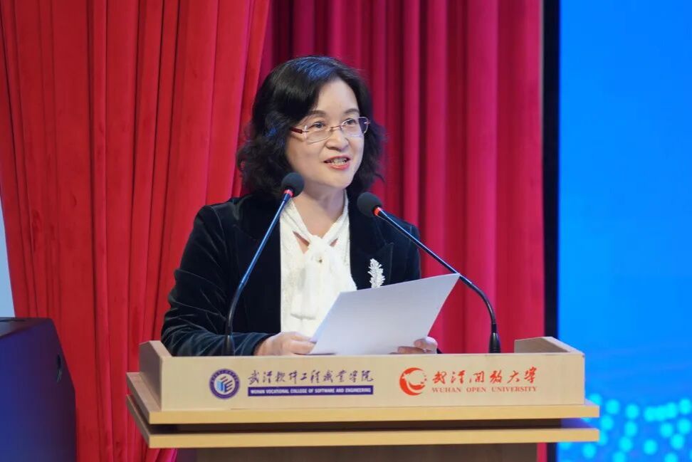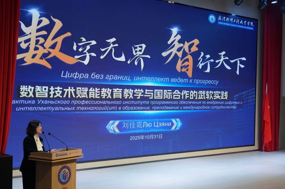 刘佳霓致辞,她代表学校全体师生,向哈萨克斯坦教育代表团一行表示热烈欢迎!她表示,此次研讨会是落实两国教育合作共识的具体行动,学校愿以会议为平台,与哈萨克斯坦Talap教育代表团及各院校、企业深化合作,共同探索AI时代职业教育创新发展新路径。