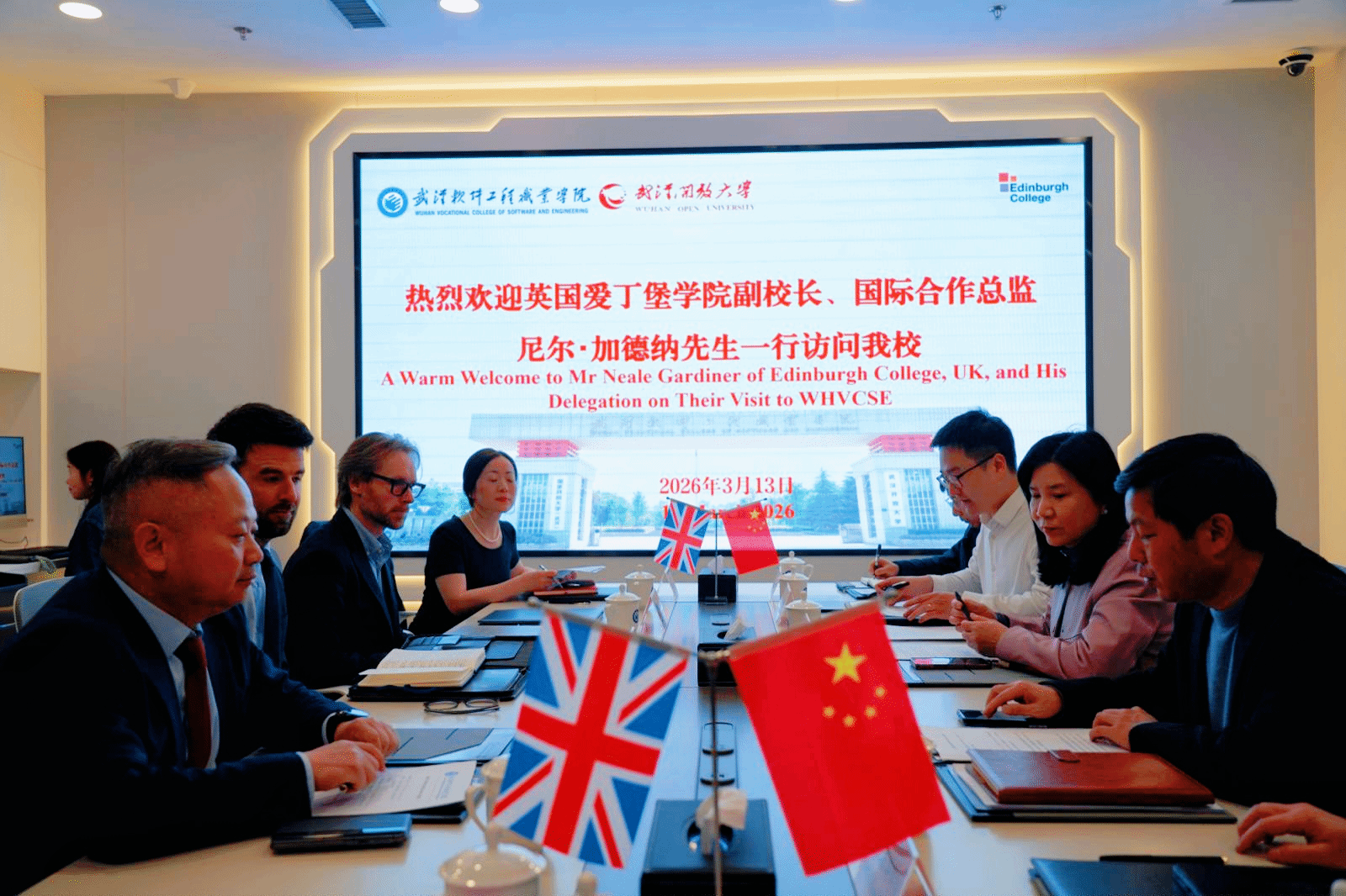 3月13日上午,英国爱丁堡学院副校长、国际合作总监尼尔・加德纳先生一行3人到访我校,就国际教育合作开展交流洽谈。武汉枫雅国际教育咨询有限公司董事长韩永广等陪同访问。国际学院院长张莉红及相关部门、学院负责人出席本次交流活动。